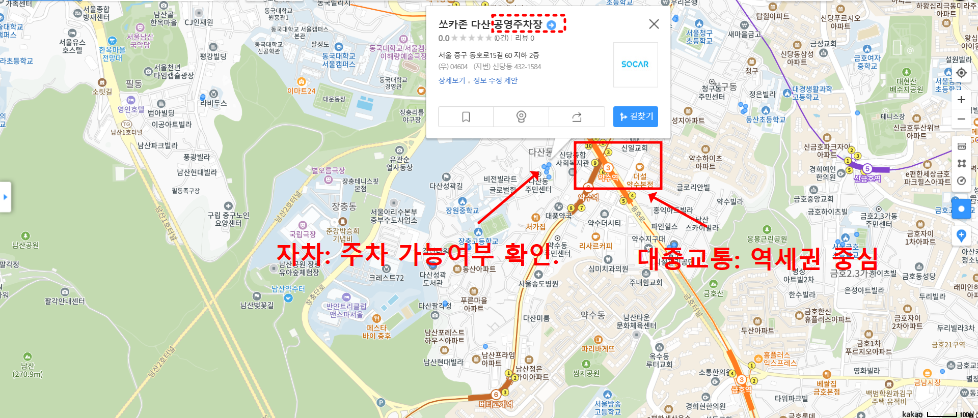 - 네이버 지도 → 도보/대중교통 소요 시간 비교